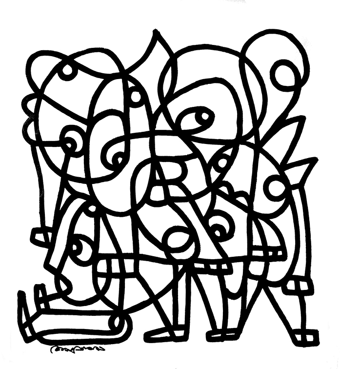 In one line, Nissim draws an entire world of human images that move through imagined spaces and that create the infinite motion of relationships and hierarchies amongst themselves.